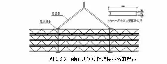 起吊時(shí),鋼筋桁架樓承板下面和上面應(yīng)設(shè)帶有U型卡口吊運(yùn)木制撐條,防止鋼筋桁架樓承板變形,偏斜等問題。吊裝應(yīng)設(shè)置兩個(gè)吊裝帶,間距1.6m,吊裝帶應(yīng)設(shè)在桁架中部,保持起吊過程中樓承板兩端平衡,如圖所示。